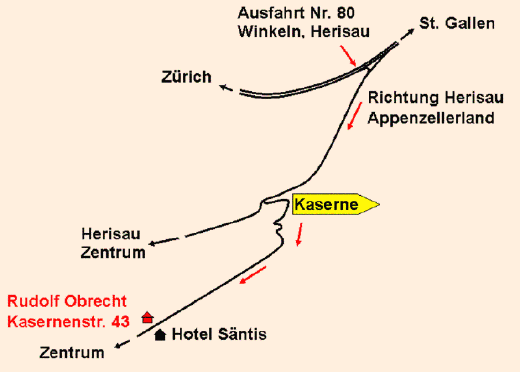 Verlassen Sie die Autobahn A 1 Zürich - St.Gallen kurz vor St. Gallen bei der Ausfahrt Nr. 80 und fahren Sie Richtung Appenzellerland. Nach ca. 1,8 km zweigt nach links eine Strasse mit gelbem Wegweiser: “Kaserne“ ab. Folgen Sie dieser Strasse bis links das Hotel Säntis kommt. Vis-à-vis sind wir.
